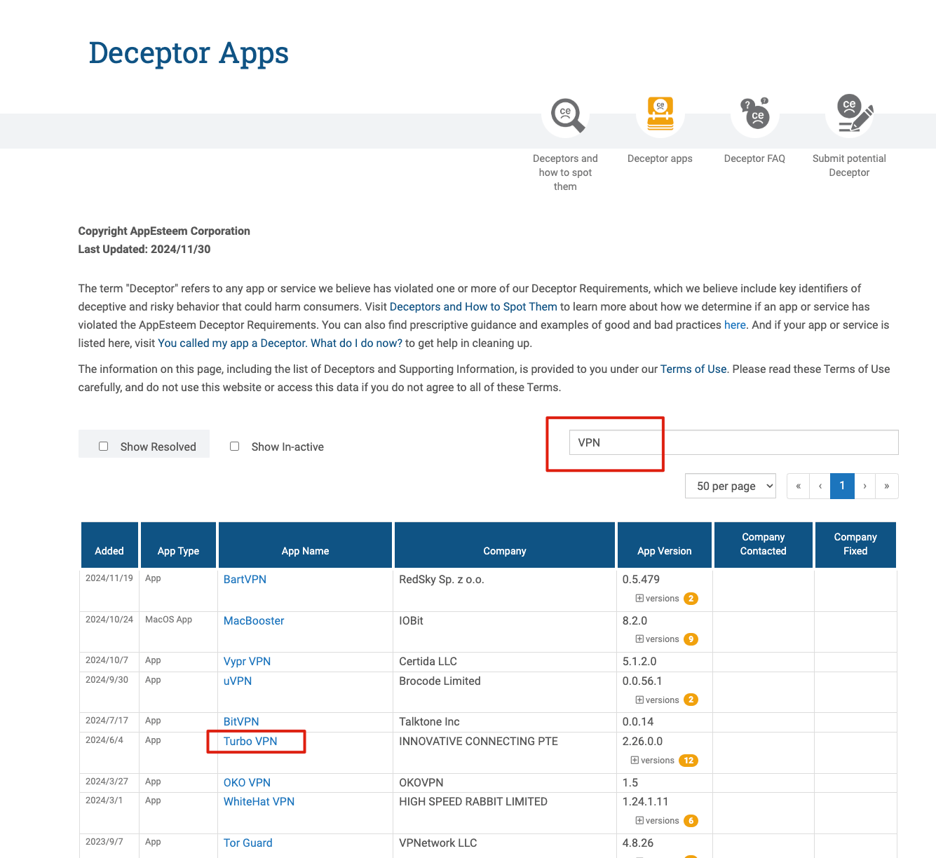 这里还有一个彩蛋,我居然在 AppEsteem 公布的欺诈软件列表中发现了很多熟悉的 VPN 产品,比如知名的 Turbo VPN 就赫然在列,你们也可以去搜索一下看看是否有自己熟悉的产品。